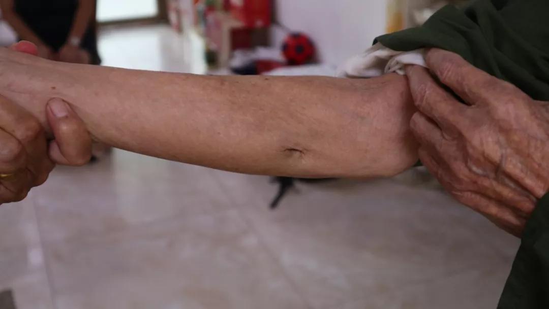 小臂上穿透的枪弹创痕